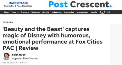 "Lumière, the ever-charming maître d’, is played with allure and enthusiasm by Danny Gardner whose energy is infectious. Lumière’s exuberant nature, combined with his smooth moves and French accent, creates an air of whimsy that contrasts beautifully with the darker elements of the story. His rendition of “Be Our Guest” is a showstopper that will leave you tapping your feet and smiling from ear to ear." - RJ Miller-Zelinko